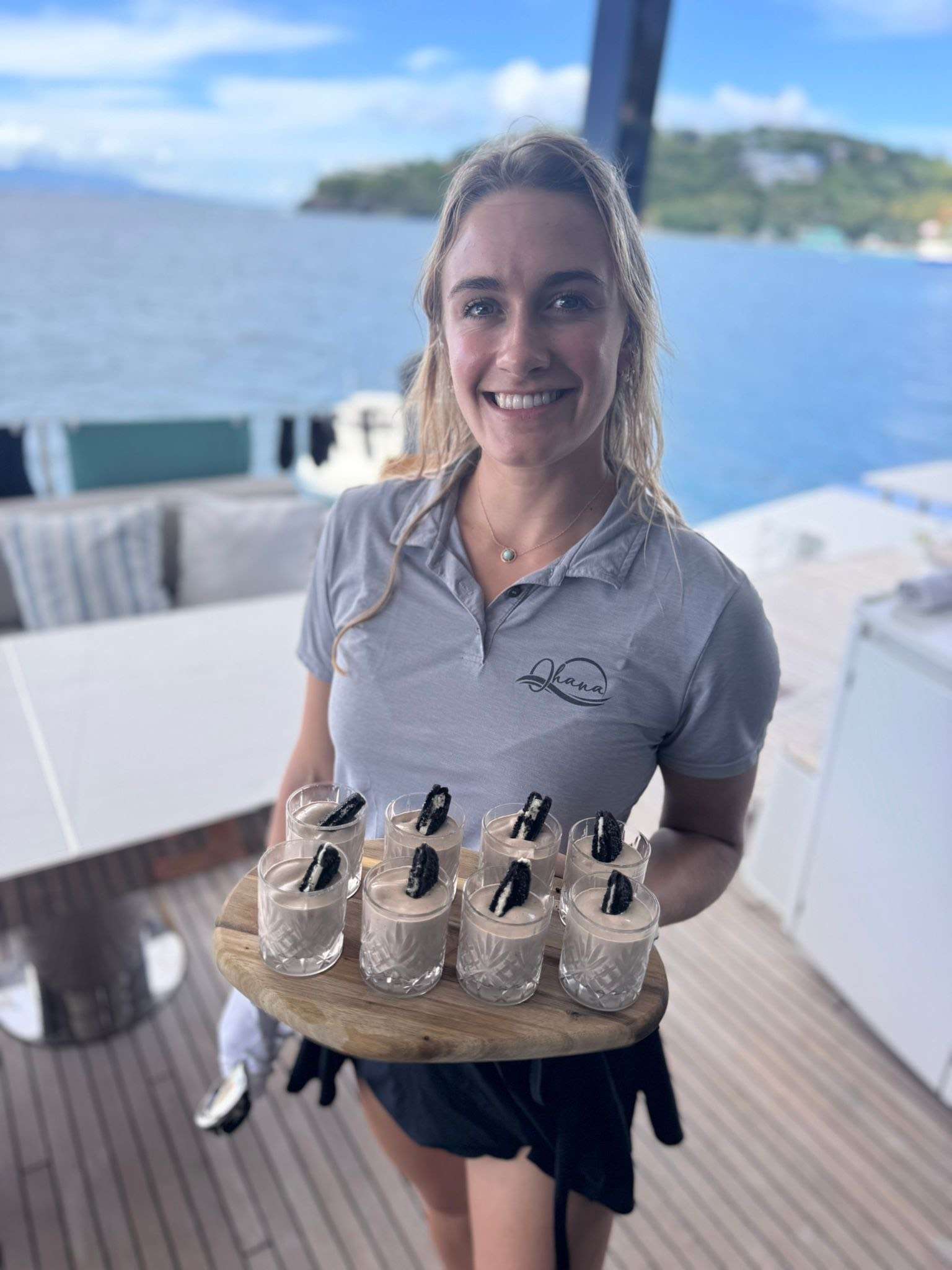 Despite growing up in a landlocked province in Canada, Maddy’s passion for aquatic pursuits has always been undeniable. She started scuba diving at age ten and has experience as a lifeguard and swim instructor. Maddy spent her summers wake-surfing, waterskiing, wakeboarding, swimming, kayaking, and paddleboarding. Recently graduated from university, with five years as a varsity student-athlete, Maddy’s competitive spirit makes her always up for a beach game, a hike, or a family board game. Her sense of teamwork and commitment to the best experience radiate through everything she does. She will ensure each moment aboard Ohana is filled with laughter, relaxation, and joy, accompanied by the hydrating drink of your choice!