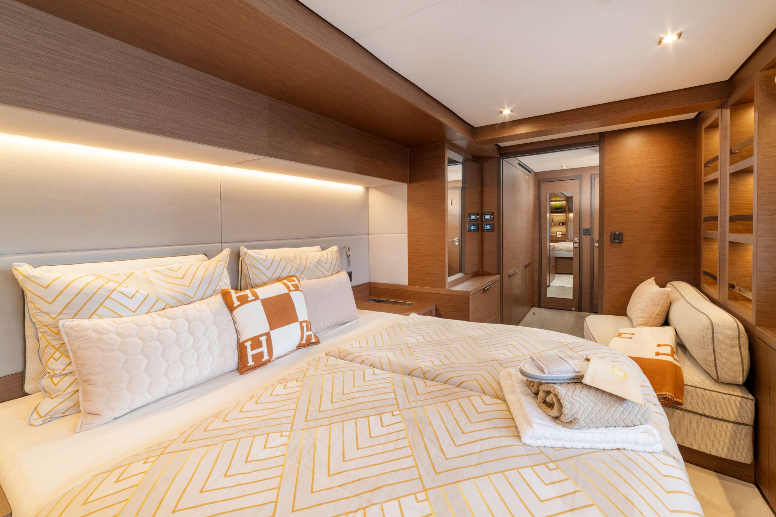 Princess S is a luxury catamaran that accommodates up to 8 guests in 1 primary cabin plus 3 queen cabins, each with its own ensuite bathroom. She has a spacious living area, a dining area, a fully equipped galley, and a large flybridge with plenty of space for sunbathing and relaxing. The yacht also has a variety of water toys onboard.