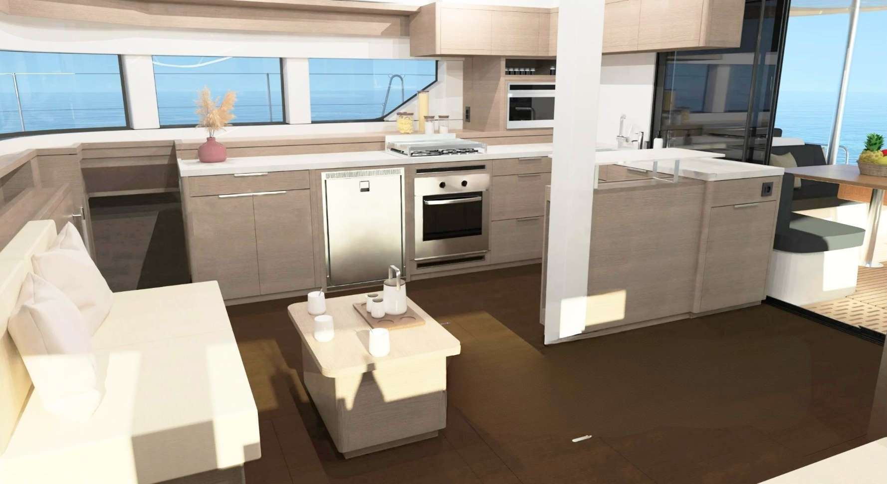 Outdoor living is equally impressive, with a spacious flybridge complete with sun-lounger pads, teak flooring, and can be fully enclosed for added comfort in all conditions. The composite hardtop with skylights and lighting creates a refined yet functional space.