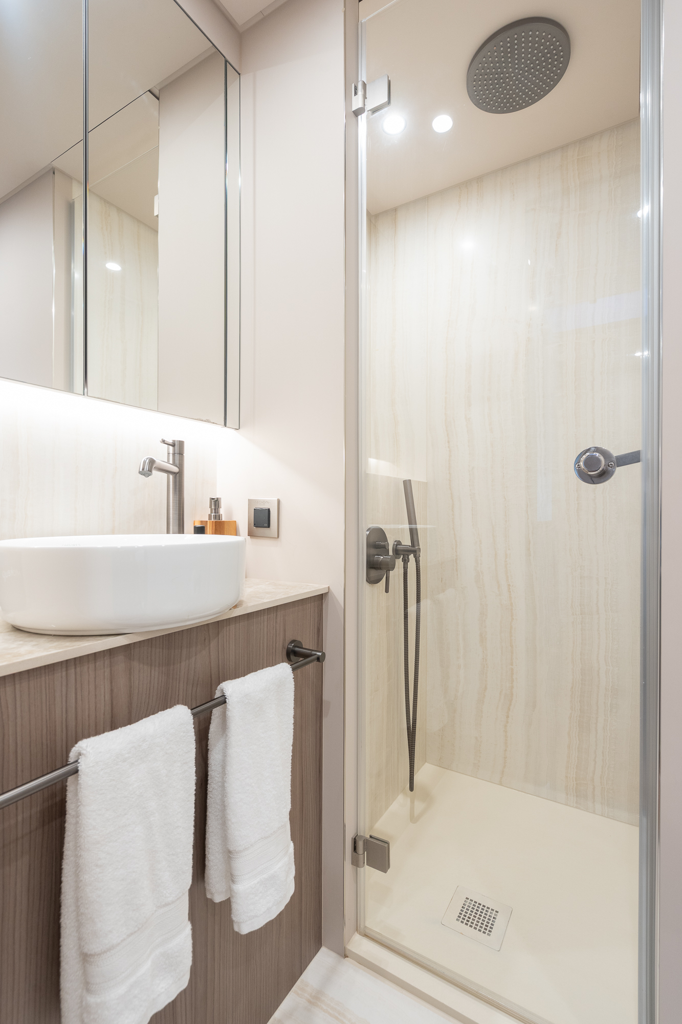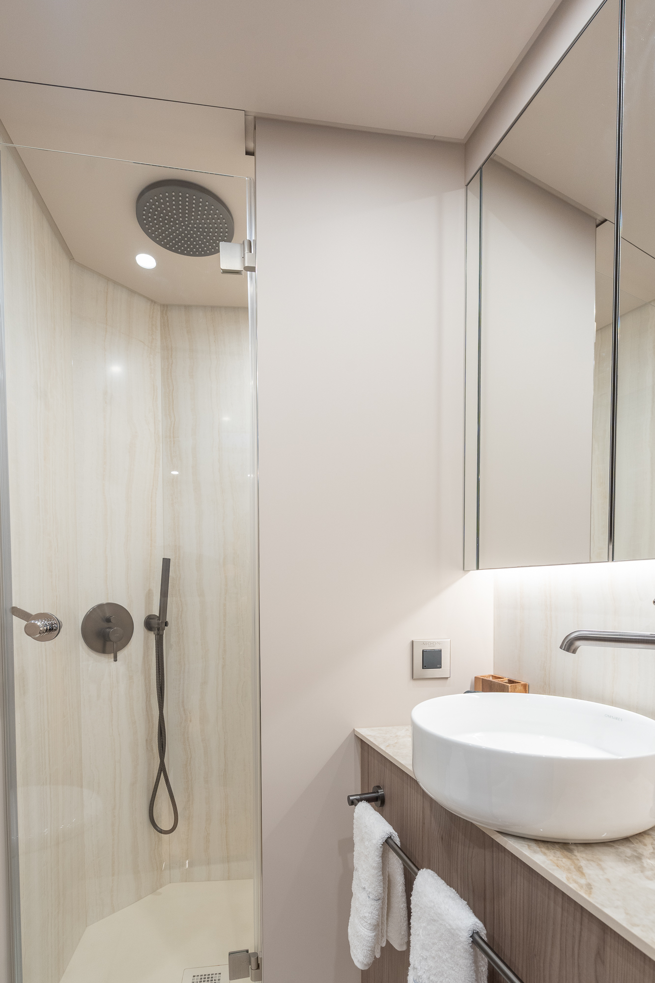 The interior of the MOON 6ty is a true feast for the senses—spacious, modern, and fully tailored to the owner’s individual preferences. The selection of materials, including natural stone, sintered surfaces, and elegant upholstery, ensures that every part of the yacht forms a cohesive, luxurious whole. Thoughtful spatial arrangement, with attention to every detail, makes the MOON 6ty the perfect space for top-tier relaxation, where each element is unique and designed with passion.